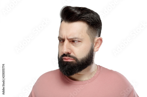 © romandatso, Fototapeta premium A cute young bearded man in pink shirt shows emotionally happy