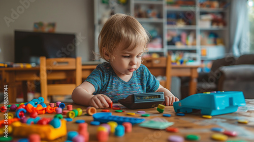 © Maksym, Fototapeta premium A cute young kid experimenting with a calculator, sitting at a wooden table filled with colorful educational items at home