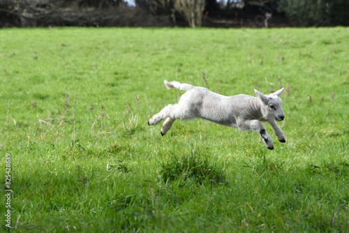 © PeteG, Obraz premium A cute young lamb leaping for joy in a sunny field at springtime