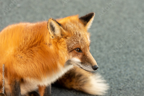Fototapeta premium A cute young wild true red fox stands on all four paws attentively staring...