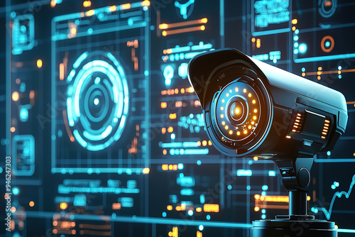 © Uwe, Obraz premium A cutting-edge security camera with a futuristic design, featuring glowing LED indicators, placed in front of a digital screen filled with real-time analytics and surveillance data