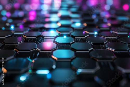 © AI_images_for_people, Obraz premium A cyber neon 3D background featuring hexagonal grids embedded in a black reflective surface. Each tile emits a pulsating light, transitioning between electric blue, purple, and magenta, creating a