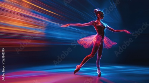 Fototapeta premium "A cybernetic ballerina dancing on a neon stage, digital light trails...