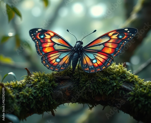 © Michael, Fototapeta premium A cybernetic butterfly with metallic wings and glowing circuits resting on a mossy tree branch Generative AI