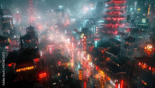 © boler, Fototapeta premium A Cyberpunk Cityscape with Neon Lights and Rain