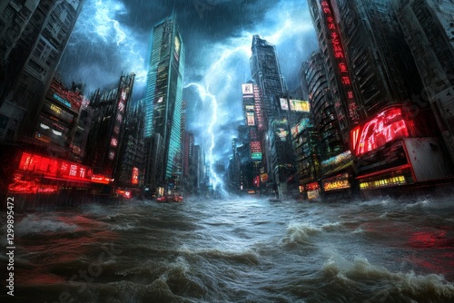 © Thanyarat, Naklejka premium A cyberpunk megacity being hit by a typhoon, with neon lights reflecting in the floodwaters