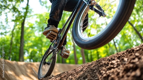© AURA COLLECTIONS, Fototapeta premium A cyclist performing tricks on a dirt track in a forested area.