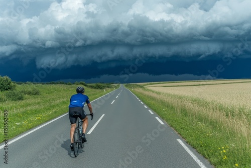 © Thanyarat, Fototapeta premium A cyclist riding on a quiet, empty highway under dramatic storm clouds with rain visible in the distance
