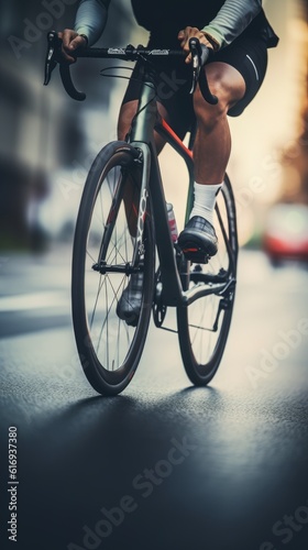 Fototapeta premium A cyclist's legs spin the pedals. Generative AI