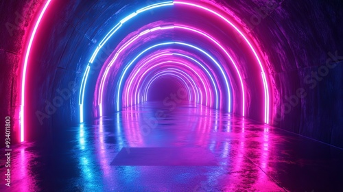 © Fexri, Naklejka premium A 3D abstract background featuring neon lights and a neon tunnel, with a space-like construction.