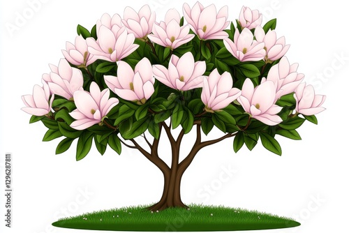 © Sanchai, Fototapeta premium a 2D cartoon illustration of a blossoming magnolia tree, elegant and pink, white background