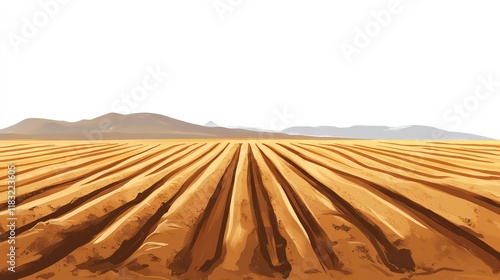 © Sakdecha, Naklejka premium a 2D cartoon illustration of a plowed field ready for planting, neat and organized, white background--ar 16:9