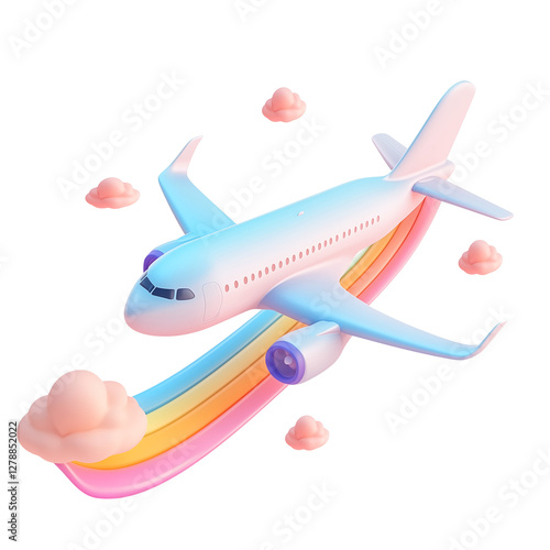 Naklejka premium A 3D cute icon of an airplane with tiny clouds and a rainbow trail, pastel...