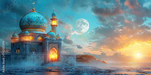© Atchariya63, Fototapeta premium A 3D Eid greeting card design showcasing a mosque and crescent in a lanterns glow set against a captivating blue background with space for messages