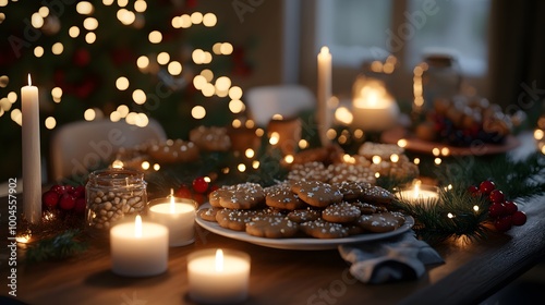 © Tonadech, Obraz premium A 3D festive table filled with Christmas cookies candles and glowing lights