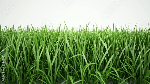 Fototapeta premium A 3D graphic of dense green grass, ideal for a sports field, perfectly trimmed and uniform, presented against a stark white background.
