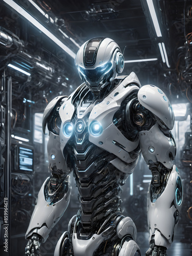 © LooPanda-Pictures, Fototapeta premium A 3D illustration of a futuristic robot, designed with sleek lines and advanced technology. The robot is shown in a dynamic pose, with glowing elements and a high-tech environment