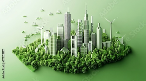 Fototapeta premium A 3D illustration of a green city with wind turbines and trees.