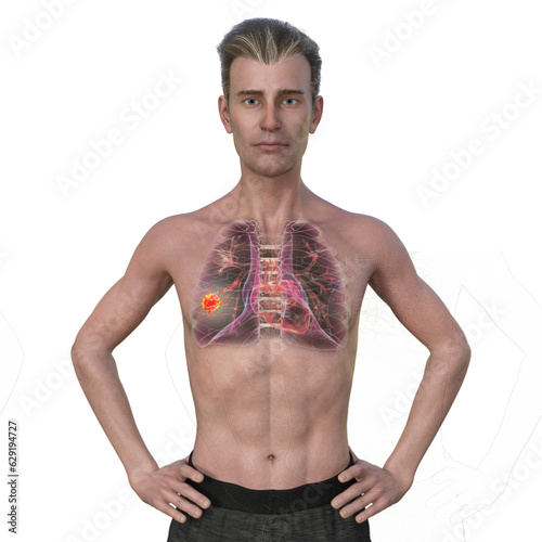 Fototapeta premium A 3D illustration of a man with transparent skin, revealing the presence of lung cancer.