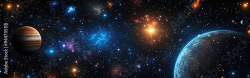© CryptoCanvas, Obraz premium A 2D illustration rendered in 3D featuring a realistic star pattern background showcasing deep interstellar space with bright stars planets and moons Diverse science fiction inspired backdrops and