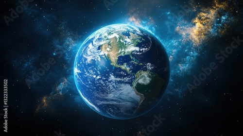 © nanskyblack, Obraz premium A 3D illustration reveals a vibrant Earth, with North America and South America taking center stage. The continents appear as distinct landmasses, their borders clearly defined, against a backdrop of