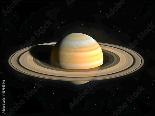 © Quick Master, Fototapeta premium A 3D illustration shows a UFO flying over an alien planet in deep space, with a ringed planet like Saturn and a bright star illuminating the cosmos