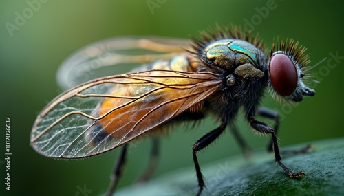 Obraz premium A 3D macro image focusing on the delicate texture of an insect wing, highlighting the iridescent colors and intricate patterns, surrounded by a softly blurred natural background.