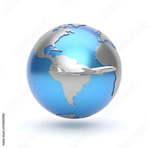 Fototapeta premium A 3D mobile app icon of a globe with an airplane, glossy texture, isolated on a white background, silver and blue tones, highly detailed.
