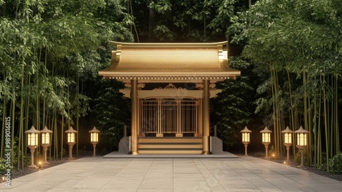 Obraz premium A 3D model of a traditional Shinto shrine with gold accents, surrounded by bamboo trees and lanterns