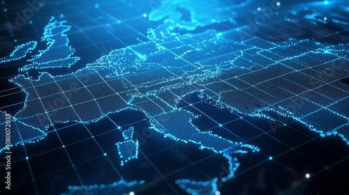 © Ceyhun, Obraz premium A 3D network map, with glowing mesh lines and points, on a sleek blue tech background
