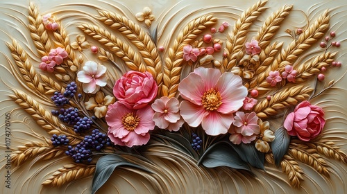 Naklejka premium A 3D outline of golden wheat and pink wildflowers entwined together.