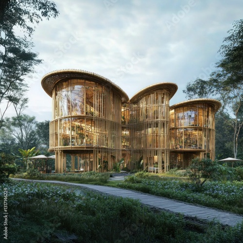 © amonrat, Fototapeta premium A 3D printer fabricating custom joints for bamboo-framed temporary shelters.