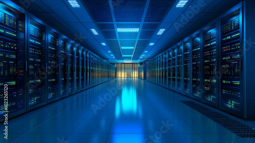 Fototapeta premium A 3D Render of a Server Room with Rows of Servers Illuminated by Blue Lights