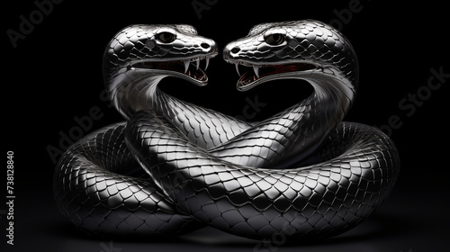 © Maria, Naklejka premium a 3d render of a silver render of two cobra's intertwined sticking their tongue outs, on a black background created with Generative AI
