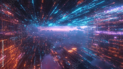 © Sawat, Fototapeta premium A D-rendered cloud computing infrastructure with global data connections glowing in neon blue.