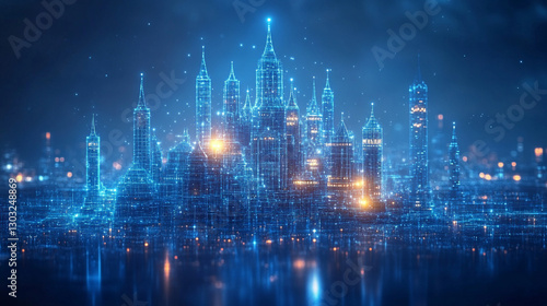© Yoonnam, Fototapeta premium A 3D-rendered futuristic castle glows vibrantly against a dark blue backdrop, symbolizing security, innovation, and digital strength. Its sleek, modern design blends architecture with technology