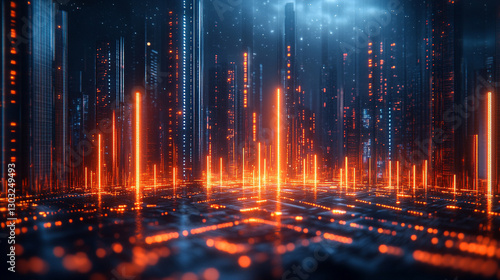 Fototapeta premium A 3D-rendered futuristic castle glows vibrantly against a dark blue backdrop,...