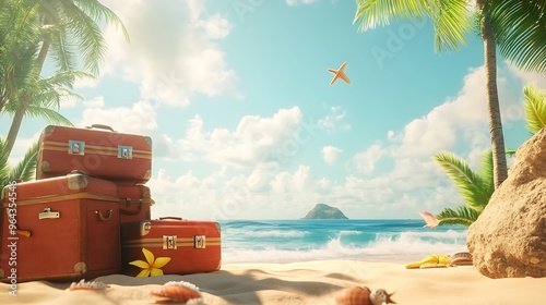 © Shahzad, Obraz premium A 3D rendered summer vacation background featuring suitcases and beach items on the sand of an exotic island