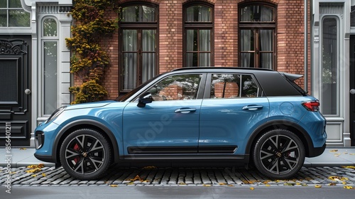 © Maxim Borbut, Obraz premium A 3D rendering of a compact city crossover in blue on a white background.