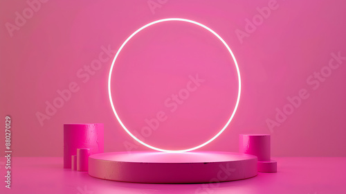 Fototapeta premium a 3D rendering of a neon podium designed for cosmetics aimed at teenagers, set against a pink background.