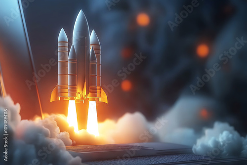 Obraz premium A 3D rendering of a rocket taking off, emerging dynamically from a laptop...