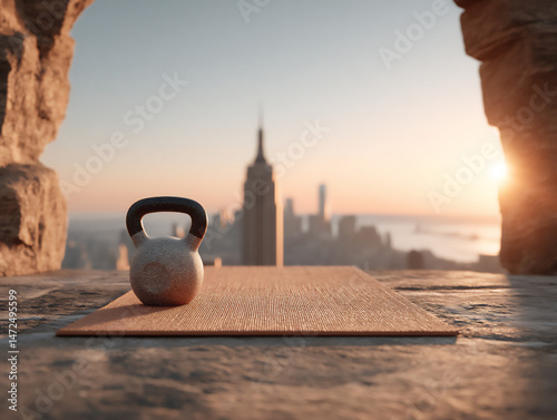 Fototapeta premium a 3d rendering of a rooftop fitness area in a city, with a yoga mat, kettlebell, and jump rope on a rubber floor. city skyline in the background at sunset.