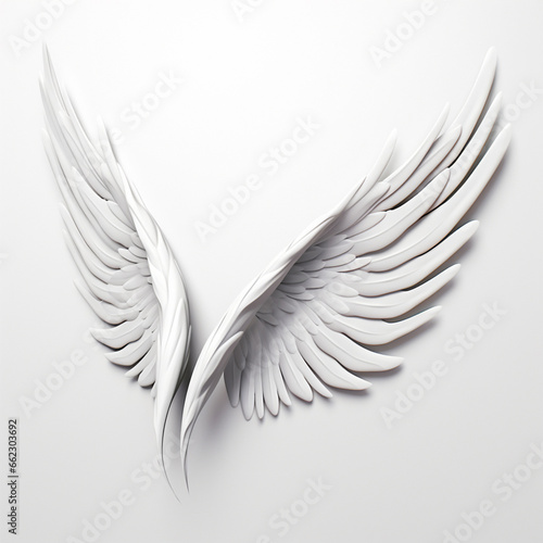 © Surachetsh, Obraz premium A 3D rendering of angelic white wings against a plain white backdrop. This resource can be used for elements such as objects, text, or 3D character cartoon figures. Generative AI.