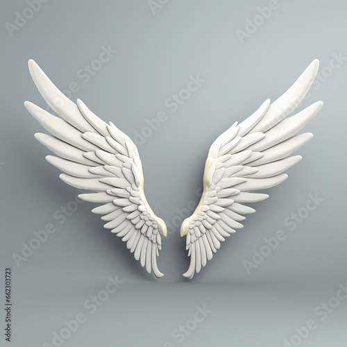 © Surachetsh, Obraz premium A 3D rendering of angelic white wings against a plain white backdrop. This resource can be used for elements such as objects, text, or 3D character cartoon figures. Generative AI.