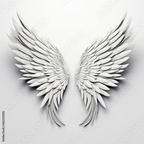 © Surachetsh, Obraz premium A 3D rendering of angelic white wings against a plain white backdrop. This resource can be used for elements such as objects, text, or 3D character cartoon figures. Generative AI.