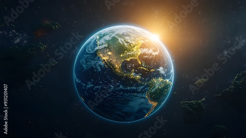 Obraz premium A 3D rendering of Earth with a sparkling, crystal-clear atmosphere, free of pollution, with rays of sunlight illuminating continents covered in green landscapes