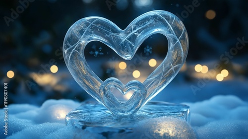 Fototapeta premium A 3D sculpture of two intertwined hearts, encased in an ice block with 2D swirling snowflakes and soft glowing lights, creating a romantic winter feel