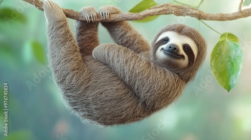 Fototapeta premium A 3D sloth hanging leisurely from a branch with a soft pastel background on...