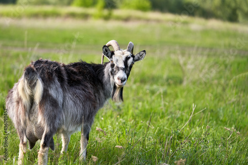© ROMAN DZIUBALO, Obraz premium A dairy goat with a full udder in the grass in the pasture. Selective focus.