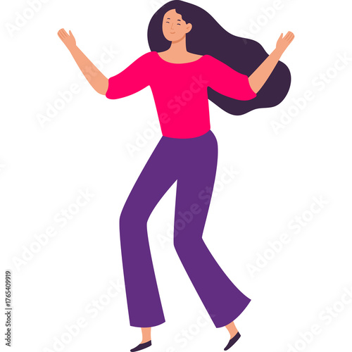 Fototapeta premium A Dancing Woman With Long Dark Hair Wearing A Pink Top And Purple Pants In A...